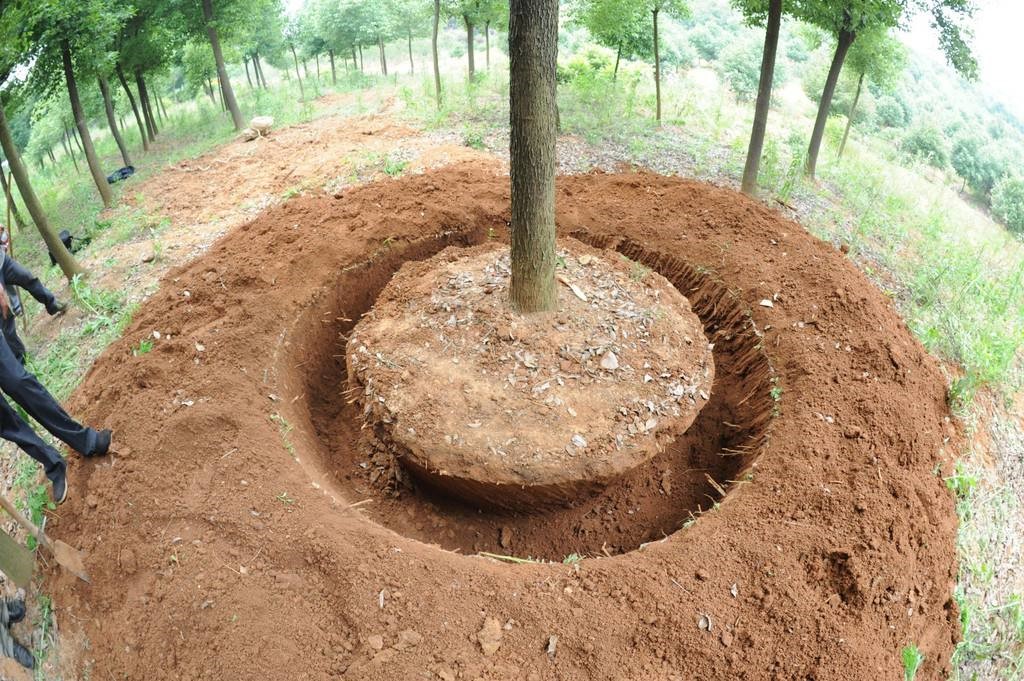 起(qǐ)掘大(dà)樹時,先在(zài)樹四周開挖環形溝。挖溝(gōu)處應在(zài)原斷根(gēn)切口以外,盡量保證(zhèng)泥球尺寸規格,一般(bān)喬木以胸徑的8倍作為泥球直(zhí)徑。土球高度一般為其直徑的60-80%。即要(yào)使掘起後的根部土球直徑大於切根範圍。挖溝的寬度應能容(róng)下工人進入溝中(zhōng)操作,一般在70CM以上。挖溝的同時,為了避免(miǎn)樹木意外倒下,要用木杆從四周將樹幹支撐起來。當土溝挖到預定深度時,再把斷根切口以外的外層土剝掉,對於細小毛根可用利鏟直接鏟斷,對於粗大根必須用手鋸鋸(jù)斷,切忌用刀鏟硬傷,避免撕裂根係。挖到土球的一半時逐漸收(shōu)底,最後形成(chéng)上大下小的倒圓台狀土球。使土球基本成形。